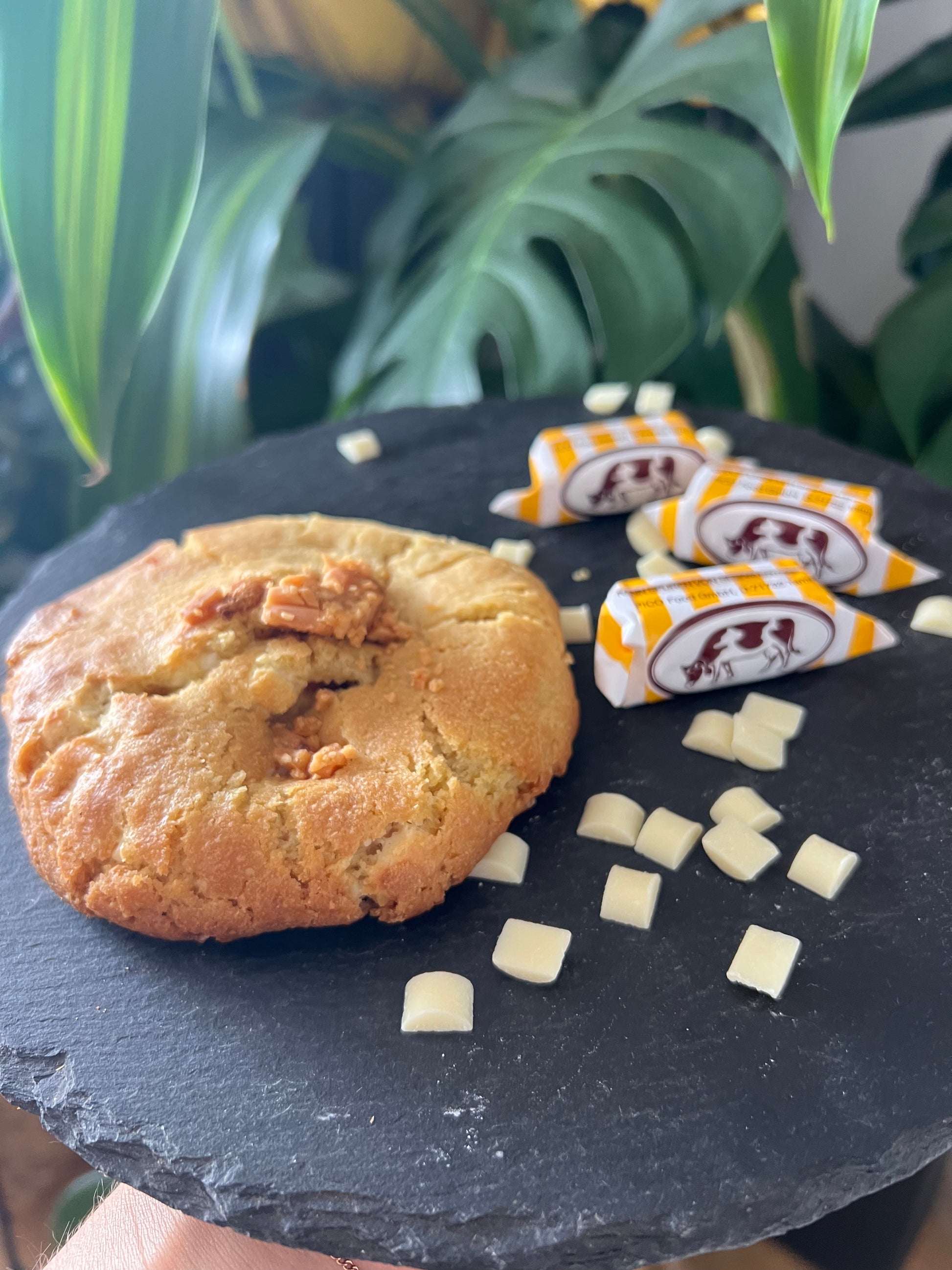 Ein mächtiger Qookie mit weisser Schokolade, karamellweichem Kern und extra viel Crunch. Aussen golden, innen gooey - der ultimative Cheat für alle, die`s ernst meinen!
